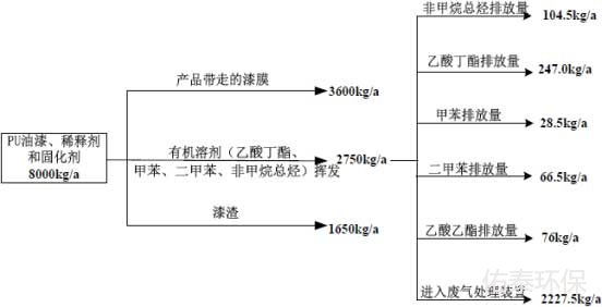 達產情況下PU油漆年用量為5t、稀釋劑年用量為1t、固化劑年用量為2t,按含量計算易揮發物質非甲烷總烴0.550t/a、乙酸丁酯1.30t/a、甲苯0.150t/a、二甲苯0.350t/a、乙酸乙酯0.40t/a,其他為樹脂等固化劑。根據噴油漆涂料用量核算表(表2-4),噴漆進入產品的量為3.600t/a。PU油漆、稀釋劑和固化劑物料平衡情況見圖2-1。
