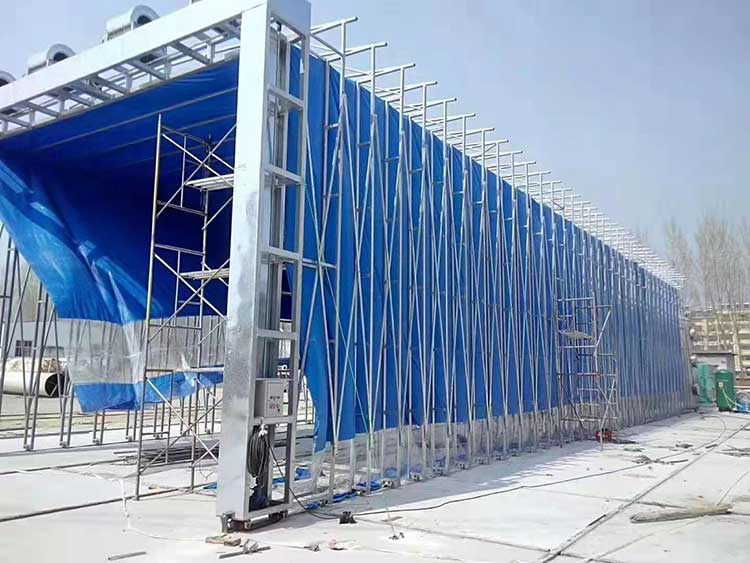 伸縮房整體為鋼制框架結構,可前后伸縮移動。框架之間的滑動連接機構框架在驅動裝置的帶動下沿地面的軌道前后豎直平行移動,同時帶動蓬布展開合攏。移動室收縮合攏時,將工件移入工作區,展開時可進行工件的噴漆或打磨等工作。在不噴漆的工作時間內,可將移動區域合攏,騰出空間場地作為其他與噴漆交叉作業的工序使用。