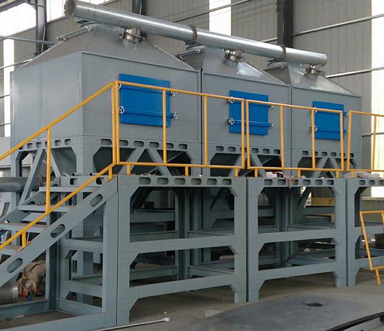 一級旋流板塔)然后再進入干式過濾器,在室中以緩慢速度通過,接觸時間為1.0秒以上,去除廢氣