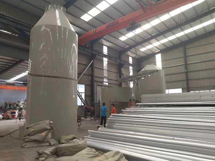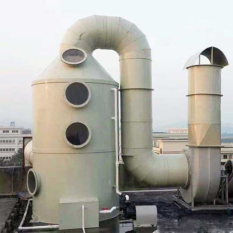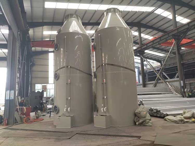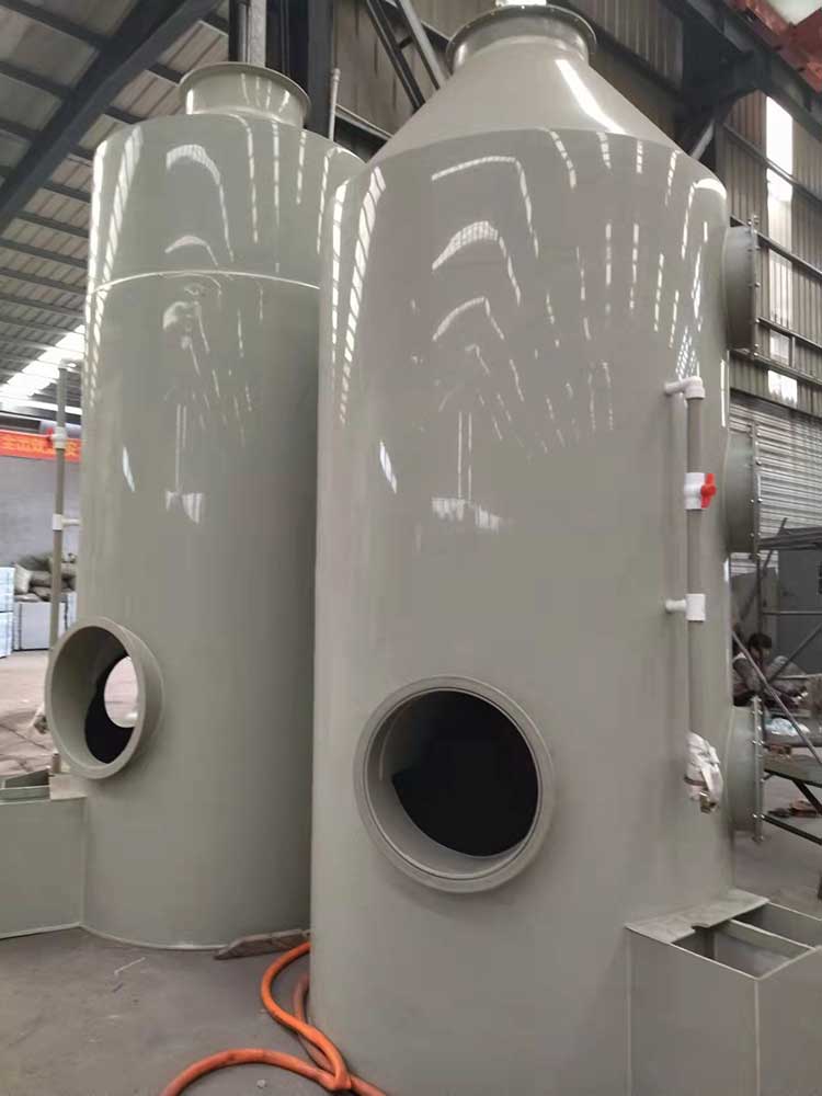 廢氣凈化塔利用氣體與液體間的接觸,而將氣體中的污染物傳送到液體中,然后再將清潔氣體與被污染的液體分離,達到清凈空氣的目的。廢氣經由廢氣凈化塔,采用氣液逆向吸收方式處理,即液體自塔頂向下以霧狀(或小液滴)噴撒而下。廢氣則由塔體(逆向流)達到氣液接觸之目的。此處理方可冷卻廢氣、調理氣體及去除顆粒,再經過除霧段處理后,排入大氣中。