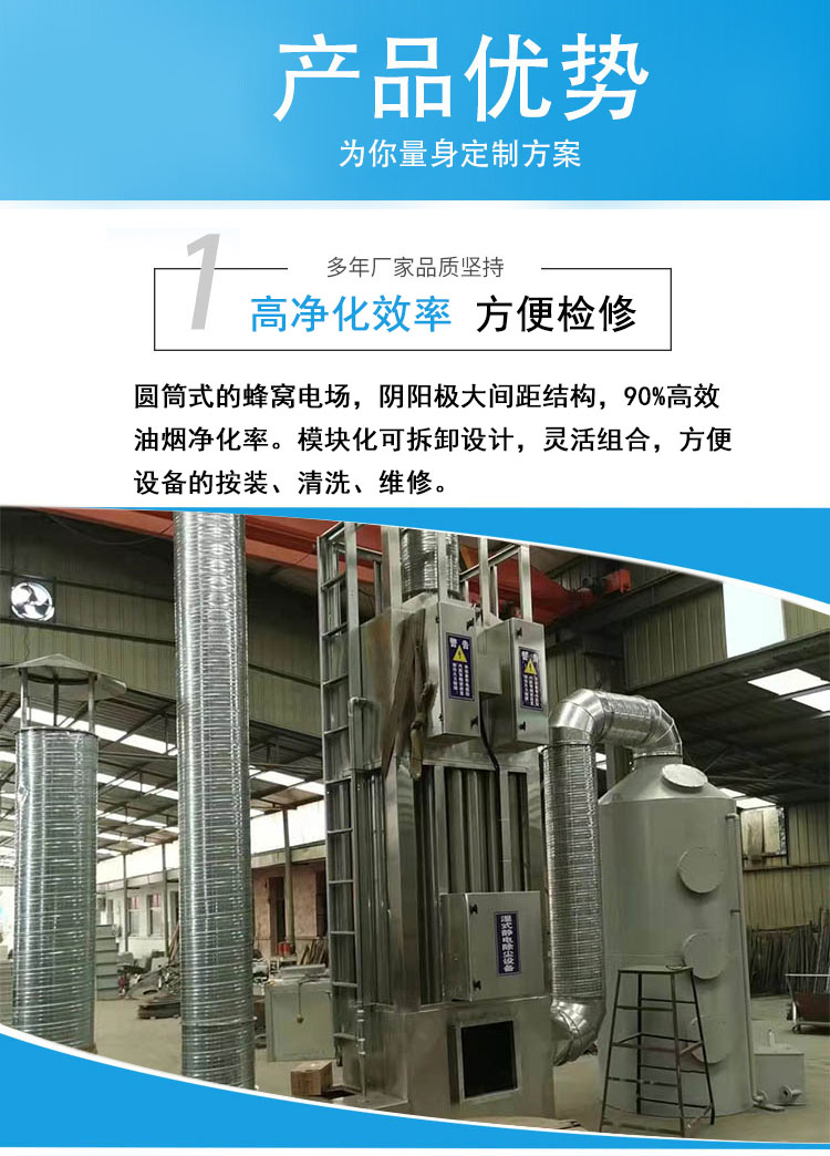 1.高凈化效率:圓筒式的蜂窩電場,陰陽極大間距結構,90%高效油煙凈化率。