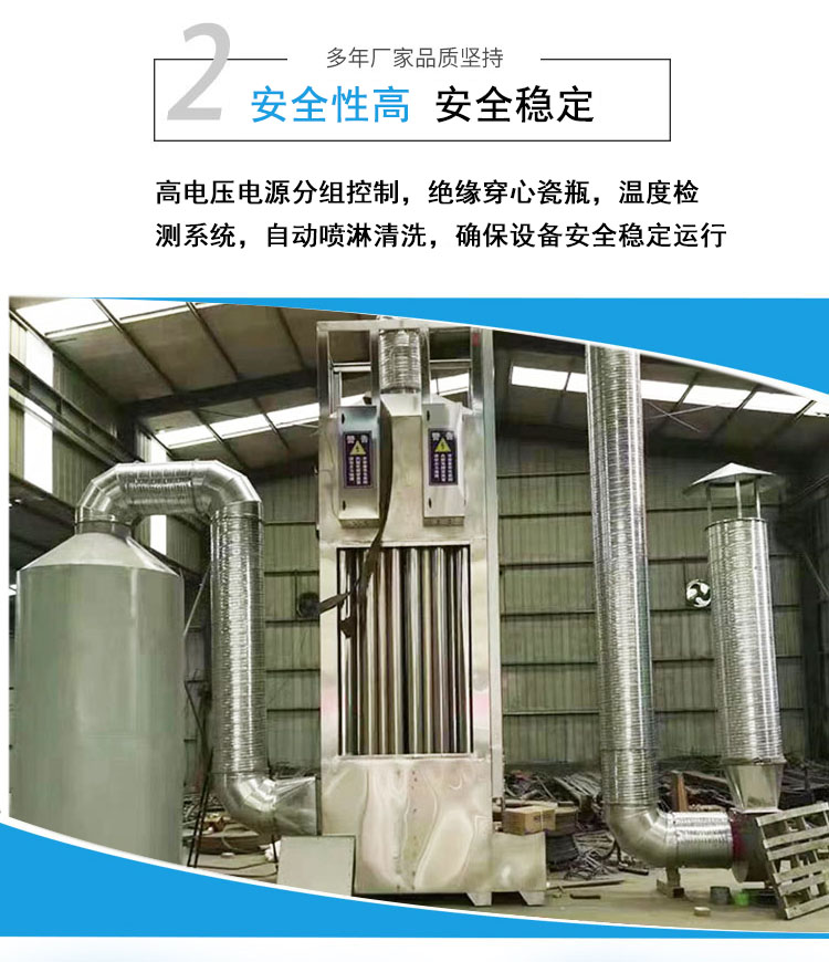 1.采用創新性的噴淋和多層高壓靜電場一體化混合設計,除塵、除油煙、降溫、滅火效果優異,沒有滴油、堵塞、燃燒的現象發生。