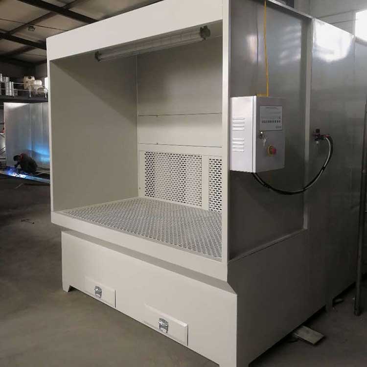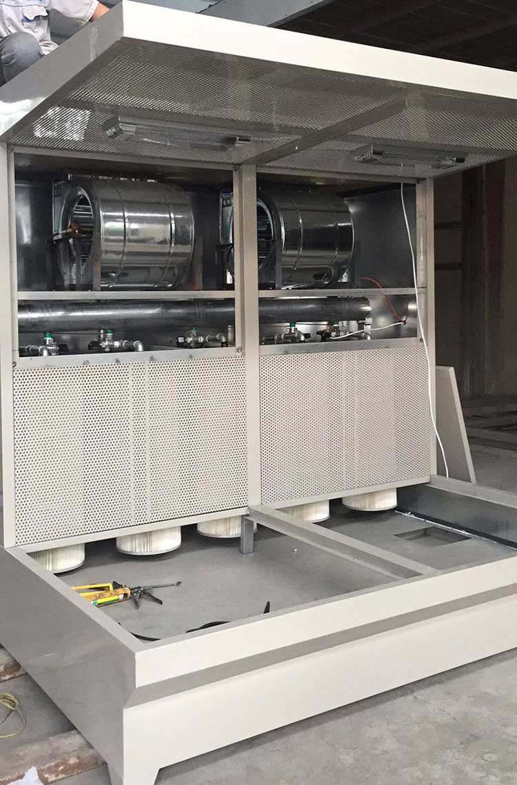 多工位打磨吸塵工作臺工作時,把工件放在工作臺面上打磨,在排風機的抽吸作用下,將工件上打磨出來的粉塵、灰塵等物吸入機內,打磨出來的粉塵不會在操作者的呼吸處停留,而隨抽風的氣流迅速抽進主機里,帶有粉塵的氣流通過百味窗透過濾芯排風過濾系統(tǒng)流向機外,粉塵顆粒經過濾芯過濾后掉下主機的集成箱里,干凈的空氣排出。還有一部分氣體通過回風道經過風口棉,再次過濾吹到工作臺面,從而達到循環(huán)的***佳效果。這樣大大改善了工作環(huán)境。