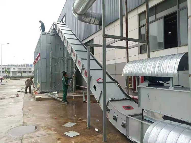 5、火情檢測盒滅火系統:設備出風口設置火情檢測探頭用于火情檢測。滅火噴淋裝置安裝于主風筒內,用于滅火,以有效保護系統的運行安全。探測器探測到火情時,立即報警,關閉主機,同時開啟消防泵進行噴淋滅火。