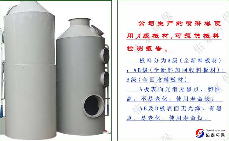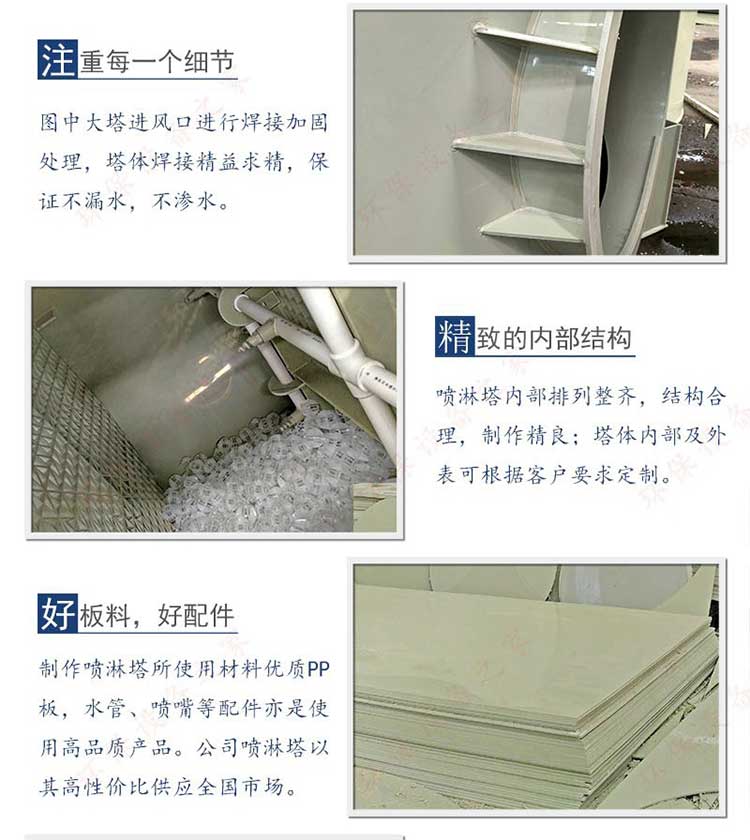 2、本公司噴淋塔配有三層浮球,二層噴淋,旋流板,及芯銅電機水泵,板料使用A級板。可按要求定制。