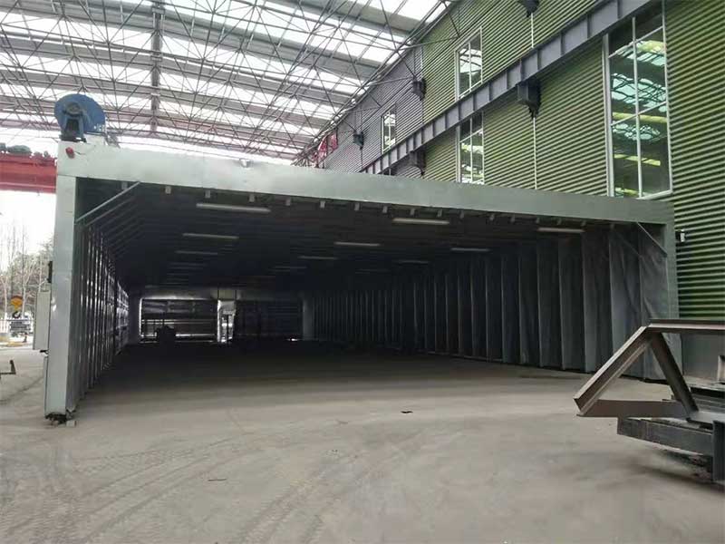 伸縮房整體為鋼制框架結構,可前后伸縮移動。框架之間的滑動連接機構框架在驅動裝置的帶動下沿地面的軌道前后豎直平行移動,同時帶動蓬布展開、合攏。移動室收縮合攏時,將工件移入工作區,展開時可進行工件的噴漆或打磨等工作。在不噴漆的工作時間內,可將移動區域合攏,騰出空間場地作為其他與噴漆交叉作業的工序使用。