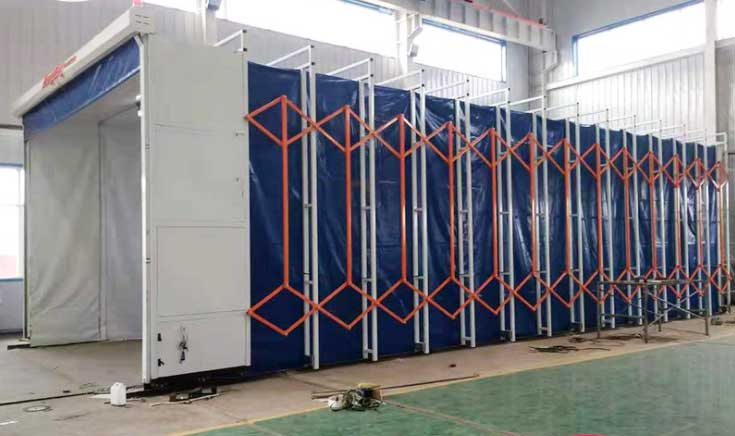 3、伸縮移動噴漆房整體為框架傳動結構,每組框架間均有阻燃PVC布密封連接,安裝快捷、外形美觀,結構精巧,使用方便,制造成本低,節約投資;